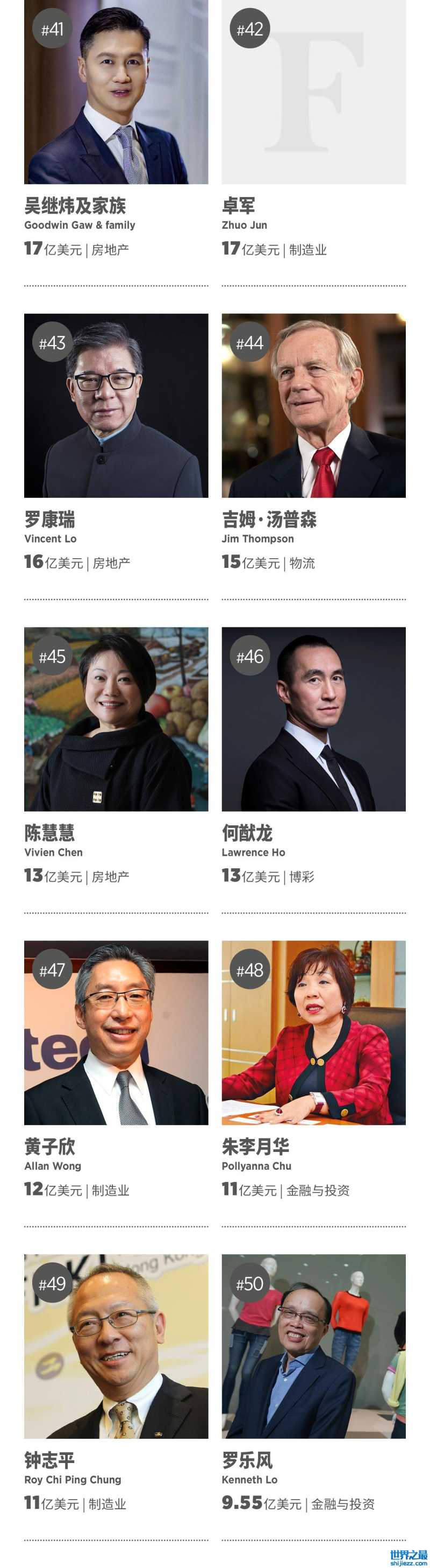 过去一年里,有两位著名的香港地产大亨去世:香港“铺王”邓成波和协和行集团主席方润华。他们的财富被几位继承人瓜分,但无人富有到可以单独上榜。与去年的10亿美元相比,今年的上榜门槛略有下降。服装制造商晶苑集团的创始人罗乐风是唯一一位重回榜单的往届上榜者,以9.55亿美元的身家排在第50位。