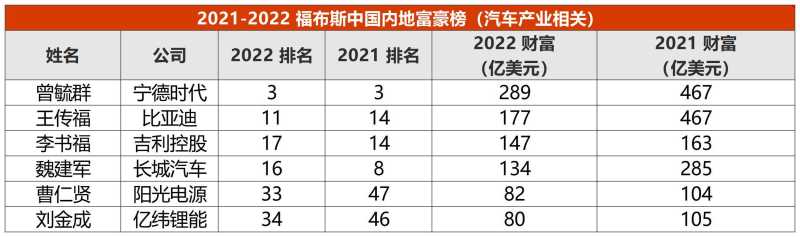11月10日《福布斯》发布2022中国内地富豪榜,国内汽车整车制造公司众,比亚迪创始人王传福、吉利控股集团董事长李书福、长城汽车董事长魏建军均榜上有名。 汽车相关企业阳光电源董事长曹仁贤、亿纬锂能创始人刘金成排名上升,小鹏汽车董事长何小鹏跌出榜单。