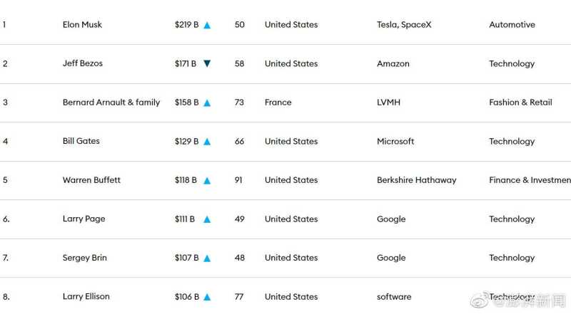最新《福布斯》全球亿万富豪榜,美国太空探索技术公司 SpaceX 创始人、特斯拉 CEO 埃隆·马斯克(Elon Musk),凭借 2190 亿美元净值成为最新首富。亚马逊创始人杰夫·贝索斯(Jeff Bezos)以 1710 亿美元排名第二,LVMH 集团 CEO 伯纳德·阿尔诺(Bernard Arnault)家族以 1580 亿美元排名第三。其后是1290 亿美元比尔·盖茨(Bill Gates)和 1180 亿美元的沃伦·巴菲特(Warren Buffett),接下来是谷歌公司的两位创始人拉里·佩奇(Larry Page)和谢尔盖·布林(Sergey Brin),资产分别为 1110 亿和 1070 亿美元。