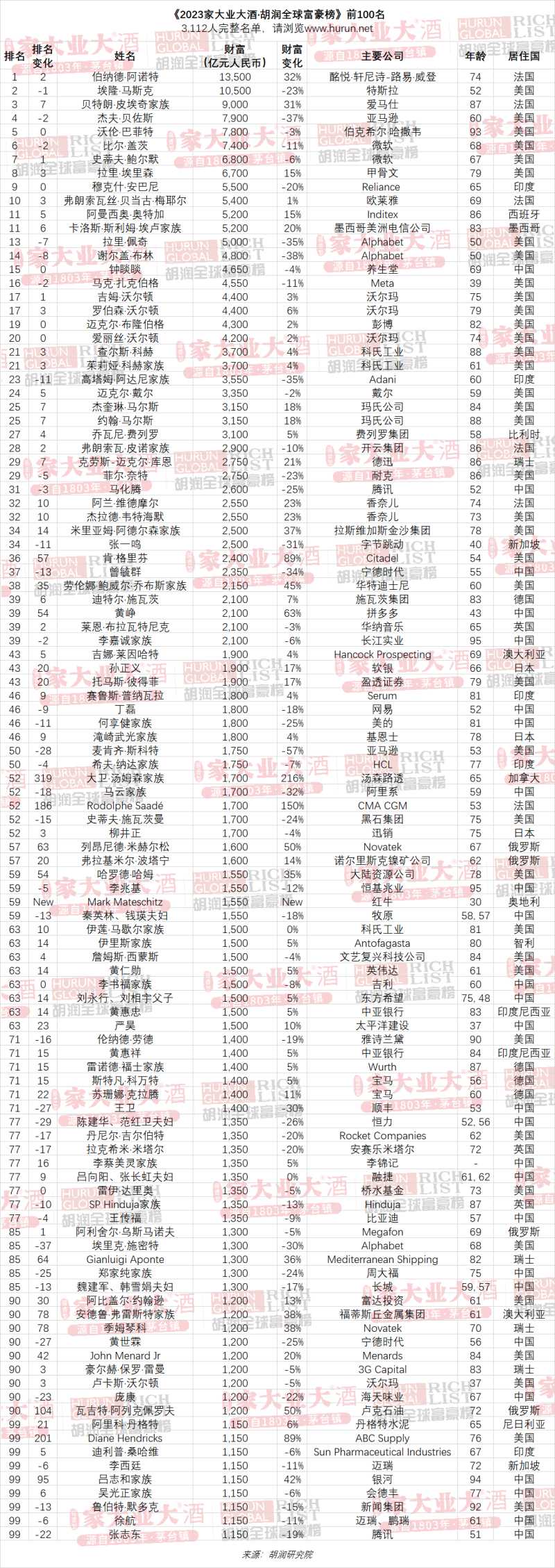 附《2023家大业大酒·胡润全球富豪榜》前100名: