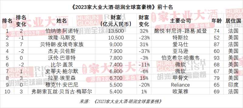 前十名总财富比去年减少1,330亿美元,至1.2万亿美元,相当于8万亿元人民币,占全榜单的9%。其中6位来自美国,3位来自法国,1位来自印度。