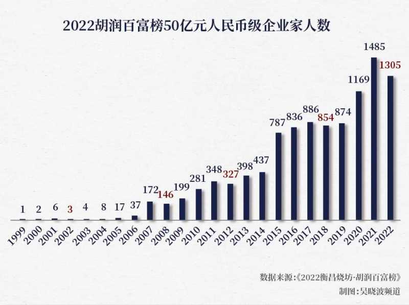 2022年的榜单里,共有1305位个人财富50亿元人民币以上的企业家上榜,比去年减少11%(共计160人);上榜企业家总财富比去年下降18%。