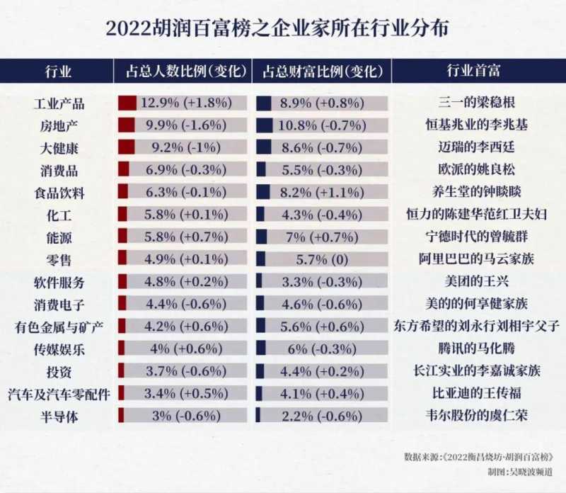 在2022年的榜单中,行业的造富强弱,浓缩在这样几张表格中: