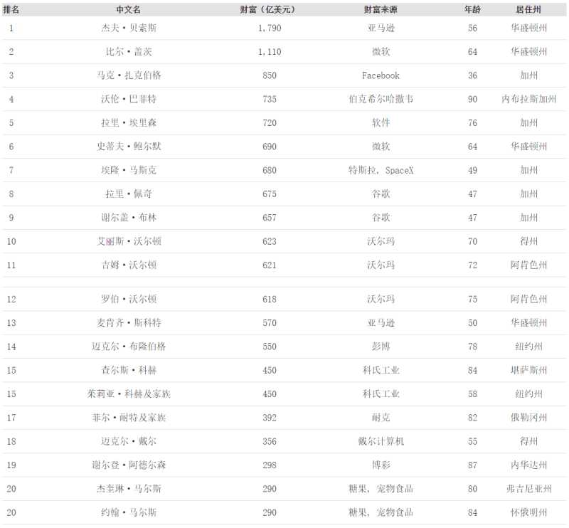 2020福布斯美国富豪榜(前20名)