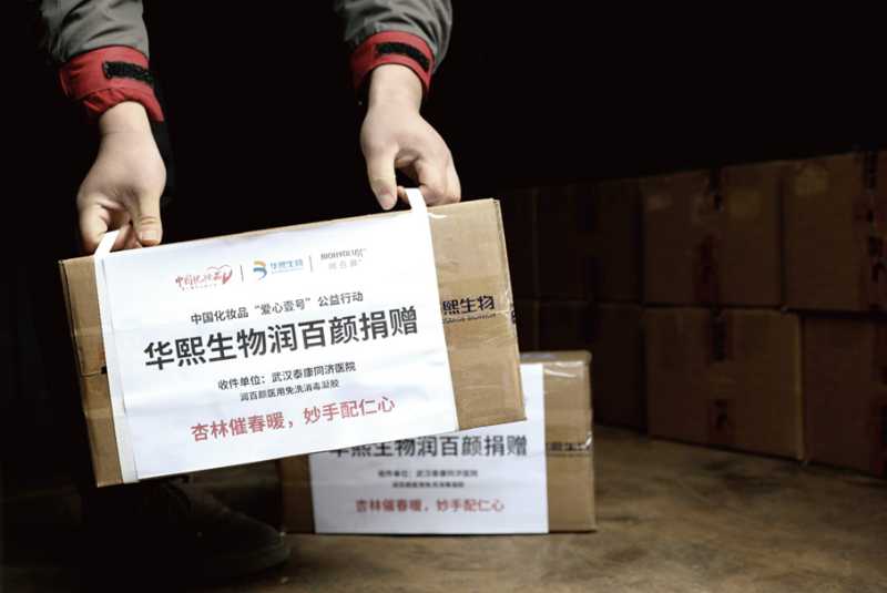 2020年疫情爆发后,华熙生物第一时间调动人力恢复生产,从国外空运调度原料助力抗疫。润百颜也积极为抗疫前线生产紧缺消毒物资,并积极组织为抗疫前线捐献活动。据悉,华熙生物前后共捐赠7批、共4万件物资,价值超过890万。