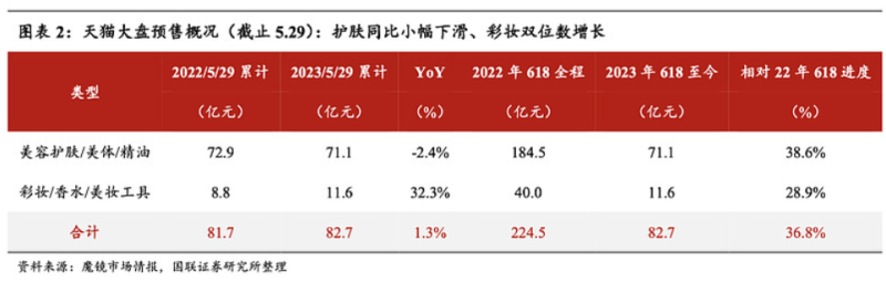 根据相关数据显示,至5月29日,天猫美妆大盘整体GMV达82.7亿,同比增长1.3%。其中,天猫护肤大盘预售GMV达71.1亿,同比小幅下滑2.4%;彩妆大盘预售GMV达11.6亿,同比增长32.3%。