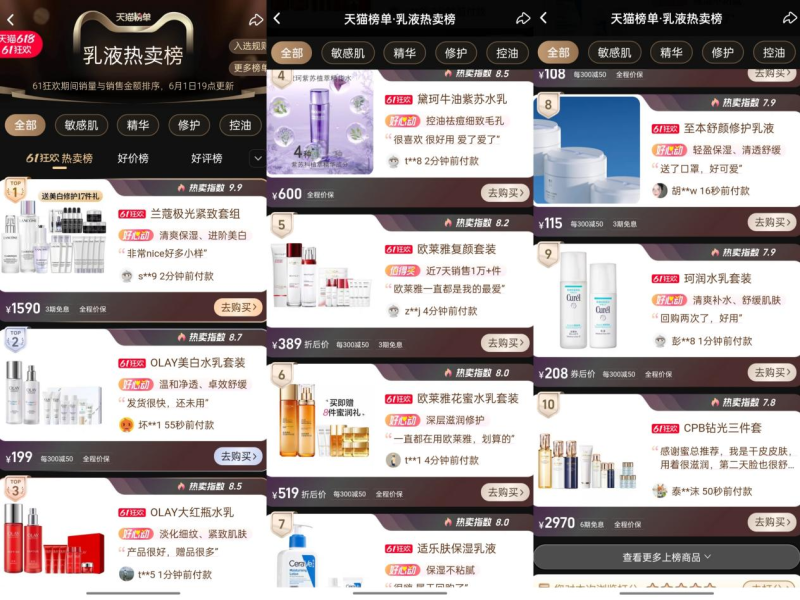 在乳液热卖榜单中,兰蔻、OLAY、黛珂、欧莱雅、适乐肤、至本、珂润和CPB等品牌均有上榜,上榜产品多主打保湿、舒缓、控油、紧致及修护等卖点。