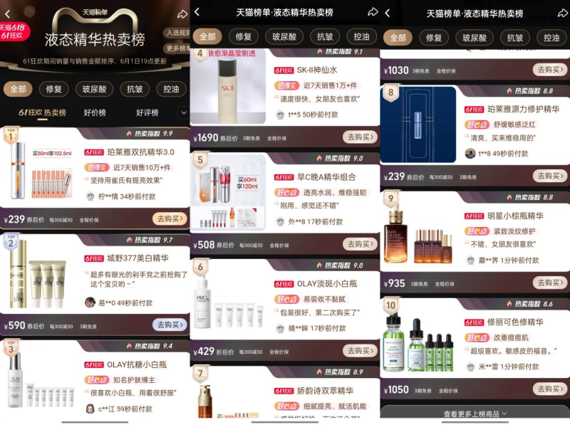 在液态精华榜单中,珀莱雅、城野医生、OLAY、SK-II、娇韵诗、雅诗兰黛和修丽可等品牌产品位列榜单之中,其中,国货品牌珀莱雅的双抗精华及源力修护精华这两个大单品均为液态精华的热卖商品。