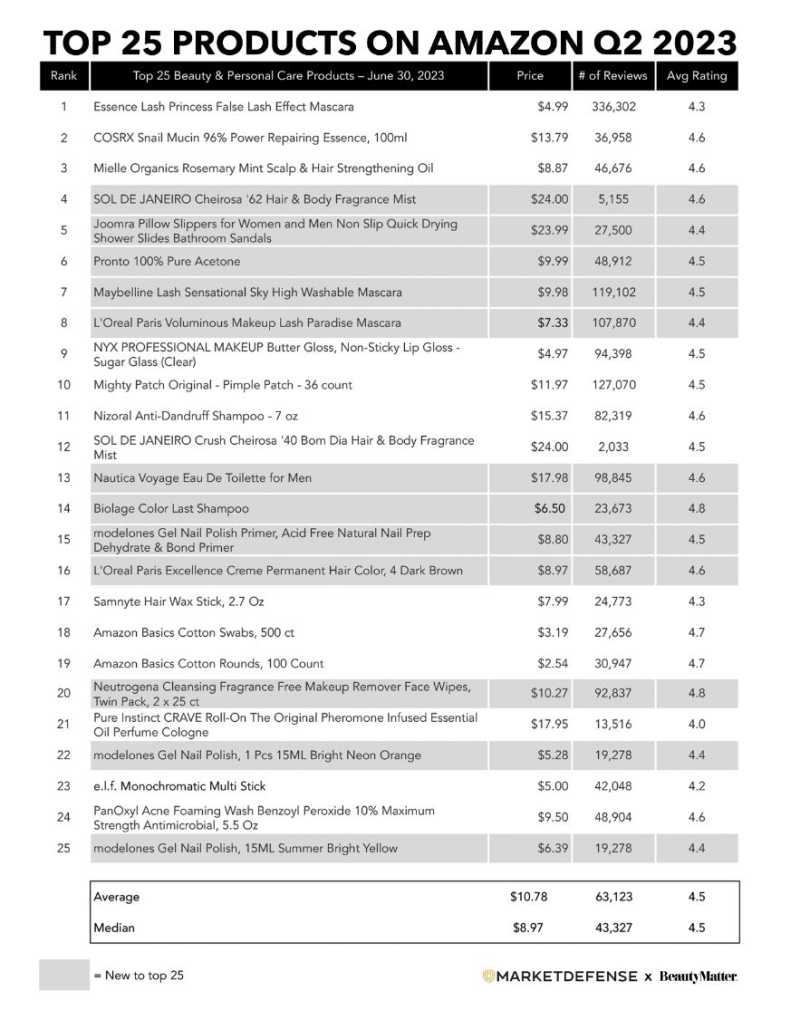 AMZ123获悉,根据BEAUTY MATTER发布的报告,2023年第二季度,有12款新产品成功跻身亚马逊“美容和个人护理25强”榜单,位居该榜单的新产品数量创下近三年新高。此外,亚马逊“美容和个人护理25强”榜单的平均建议零售价为10.78美元,比上一季度(13.78美元)下降22%,创下历史新低。由于生活成本上升,价格的下降也导致消费者对美容产品的需求不断上涨。