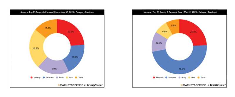 BEAUTY MATTER称,产品类别的多样化有助于平衡前25名榜单所追踪的所有美容类别——彩妆、护肤、身体、头发和工具的竞争环境。但是,这在很大程度上是以牺牲护肤品为代价的,护肤品在榜单中的占比从第一季度的48%降至第二季度的19%。相反的是,美体、美发和美妆工具的销量都有显著增长。