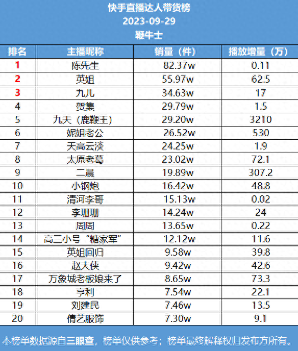 快手榜一陈先生,销量82.37万件;榜二是英姐,销量55.97万件;榜三九儿,销量34.63万件。