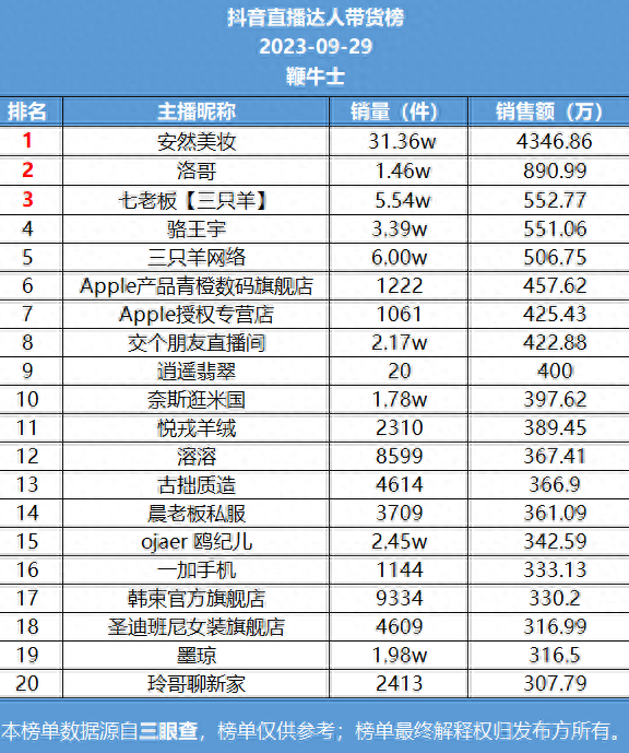9月29日,抖音直播达人带货榜一是安然美妆,销售额4346.86万;榜二洛哥,销售额890.99万;榜三七老板,销售额552.77万。