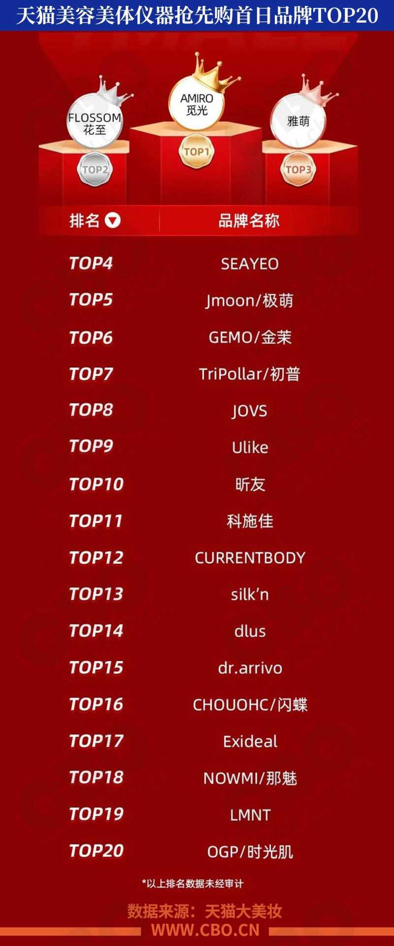 美容仪榜单前三依次是AMIRO觅光、花至、雅萌。据悉,斩获TOP1的觅光成立于2015年,品牌成功从智能化妆镜转型为美容仪,瞄准精准护肤,去年销售额破20亿。