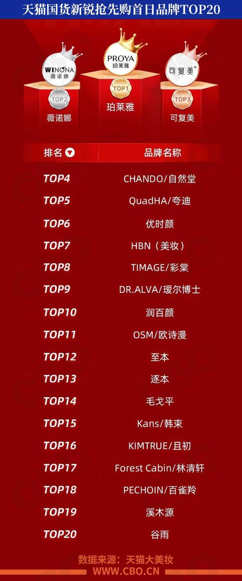 TOP20品牌中,国货品牌占据6个席位,比去年多两席。新品牌的表现十分亮眼,可复美、夸迪、优时颜进入榜单,分列第13、第18、第19。据悉,预售开售一小时可复美增长1745%。