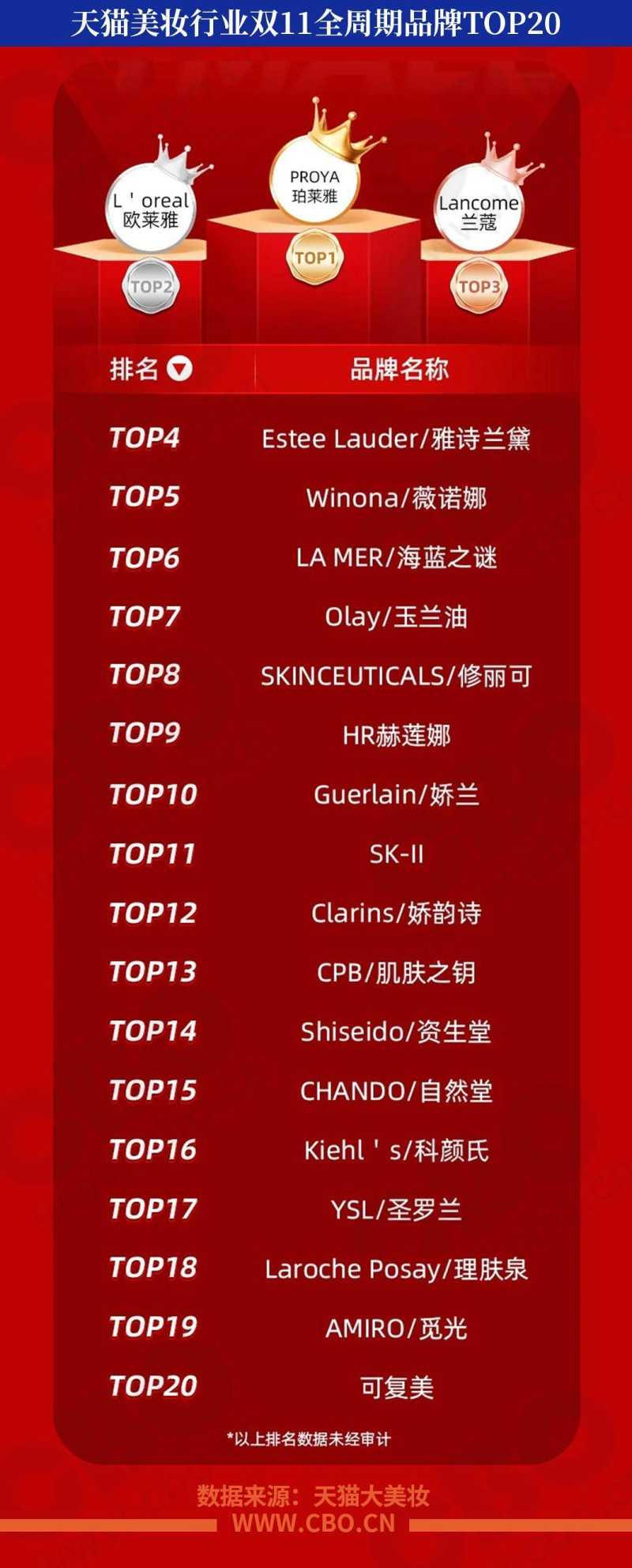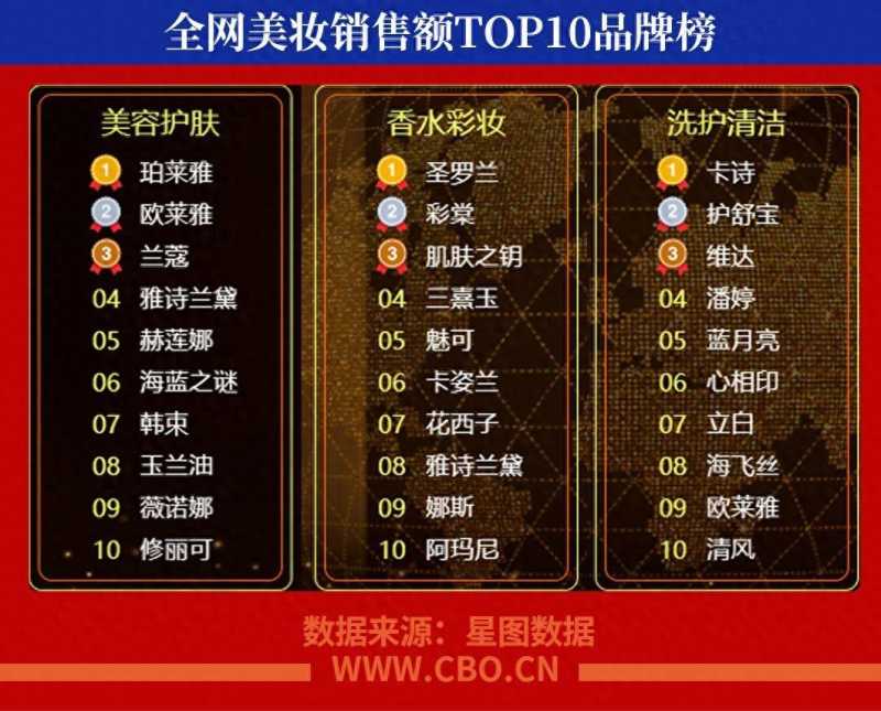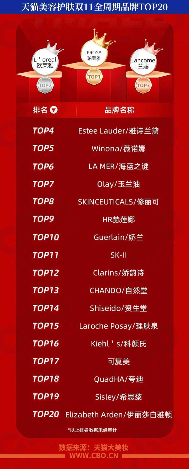 天猫美妆大盘及美容护肤榜单前三均为珀莱雅、欧莱雅、兰蔻。