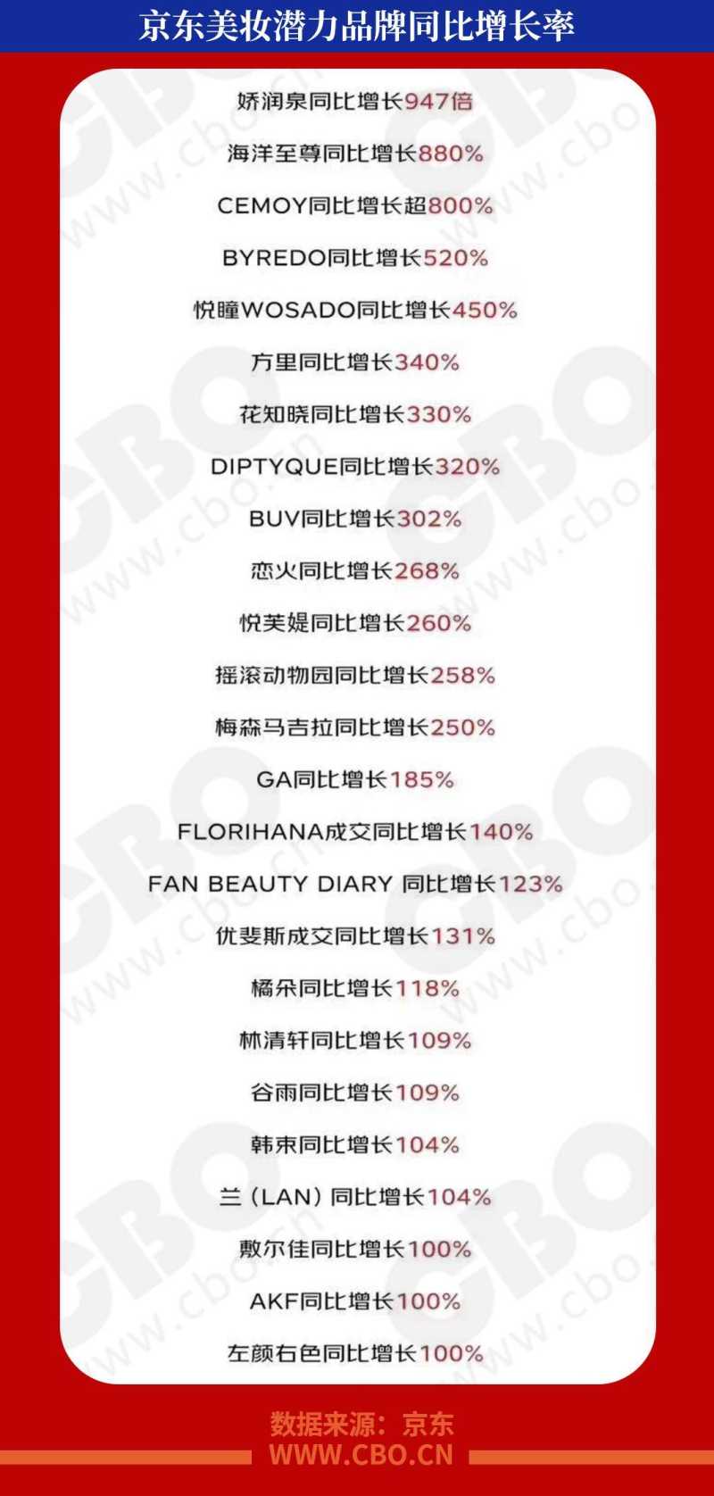 高增速潜力美妆品牌中,多个国货品牌被点名:男士品牌海洋至尊同比增长880%、左颜右色同比增长100%,彩妆品牌方里同比增长340%、花知晓同比增长330%、恋火同比增长268%、橘朵同比增长109%,个护品牌摇滚动物园同比增长250%。护肤品牌FAN BEAUTY DIART同比增长123%、林清轩同比增长109%、谷雨同比增长104%、韩束同比增长104%、敷尔佳同比增长100%、兰(lan)同比增长100%。