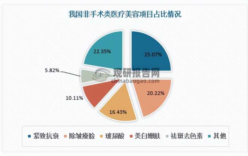 从项目看,吸脂、鼻综合、眼综合、面部提升、隆胸为我国前五大手术类医疗美容项目,分别占比17.07%、8.64%、8.1%、8%、6.11%,总占比接近50%。紧致抗衰、除皱瘦脸、玻尿酸、美白嫩肤、祛斑去色素为我国前五大非手术类医疗美容项目,分别占比25.07%、20.22%、16.43%、10.11%、5.82%,总占比接近80%。