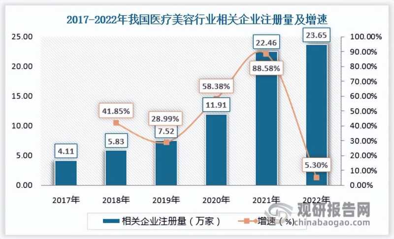 医疗美容行业加速发展,市场前景广阔,吸引相关企业持续涌入。2021年我国医疗美容行业相关企业注册量已超20万家。2022年我国医疗美容行业相关企业注册量保持增长,达23.65万家,较上年同比增长5.30%。