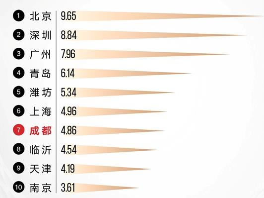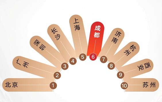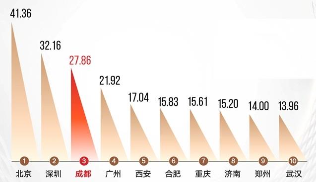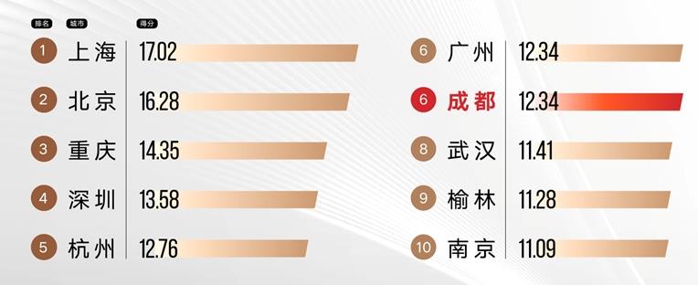 在人才指数方面,北京、广州、深圳、长沙、上海排名前五位,成都位居第六。在资本指数方面,北京、深圳、成都、广州、西安表现突出。在科技指数方面,北京、深圳、广州、青岛、潍坊位列前五,上海、成都紧随其后。而上海、北京、重庆、深圳和杭州则在消费指数方面表现较好,位列前五。