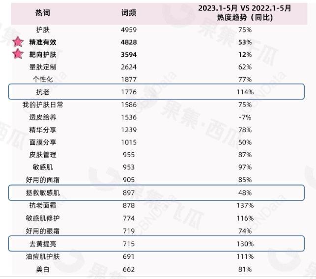 社交平台上的护肤相关热议词,图片来源:果集《2023社媒平台精准护肤人群洞察》