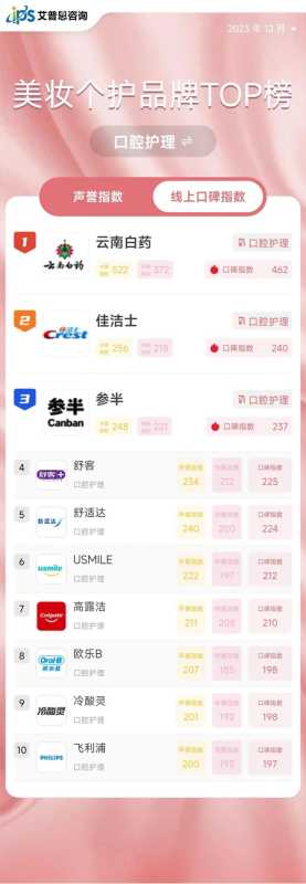 2023年12月中国美妆个护品牌线上口碑指数TOP50