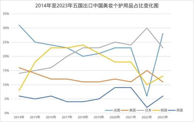 相比之下,2023年法国美妆在中国市场重回巅峰,在中国进口他国美妆个护产品中占比最高,高达28%,仅次于2014年的31%。英国和美国的化妆品在中国市场的份额则在近10年来均稳定在16%以下和10%以下。