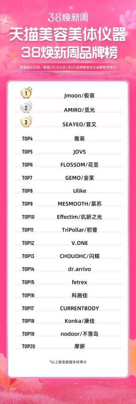 品牌“卡位战”趋于稳定。与去年的“3·8节”、“6·18”、双11等大促榜单相似,位居榜单前列的美容仪品牌组合已基本稳定,极萌、觅光、雅萌、昔又等均是榜单前5的“常客”。