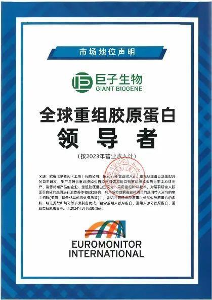 日前,巨子生物获得世界权威市场调研机构欧睿咨询颁发的“全球重组胶原蛋白领导者”认证。