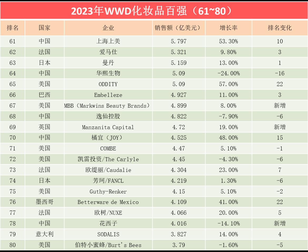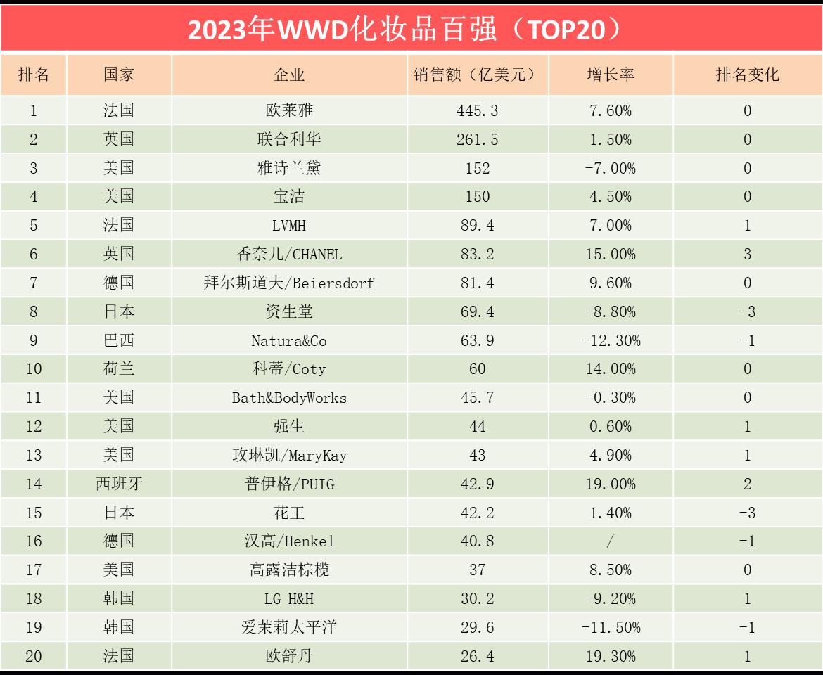 近日,著名化妆品媒体女装日报(WWD)公布了2023年全球美妆企业百强名单,入围销售门槛为2.44亿美元,比上年的2.53亿美元略有下降。百强企业总销售额达到创纪录的2451.7亿美元,同比增长5.3%。