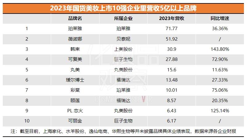 一方面,国货美妆上市企业TOP1首次易主,珀莱雅以89.05亿元的营收登顶。