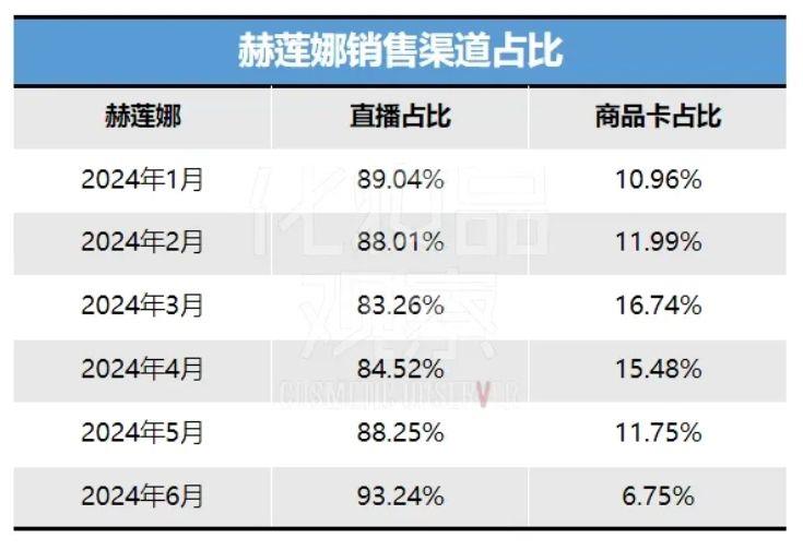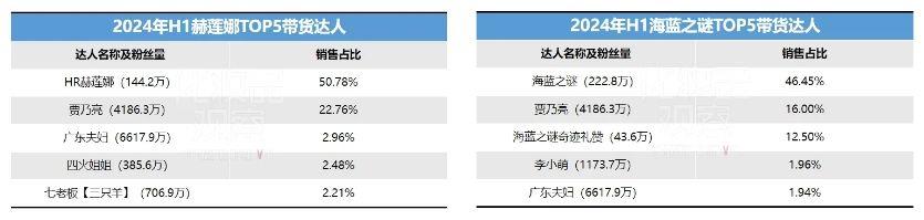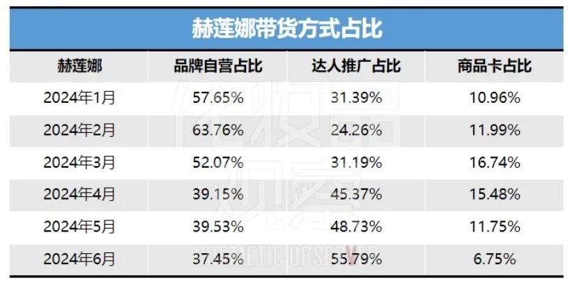 2022年,赫莲娜在抖音的自播带货销售占比仅为个位数,而达人带货销售占比高达80%以上,2024年至今,其抖音自播销售占比超45%,而达人带货销售占比缩减至45%以内。