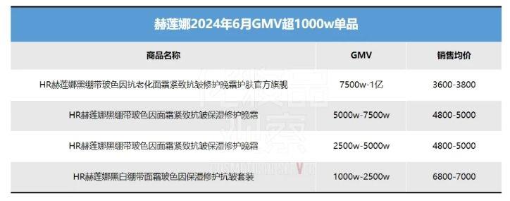 区别于白牌起量需要靠跑品、国货起量需要不停的强调价格实惠,赫莲娜作为顶奢品牌在抖音上的优势之一,是产品自带流量。从5-6月份成交超1000w单品来看,均是王牌产品黑绷带面霜以及黑白绷带面霜套装,销售均价都在3000元以上。