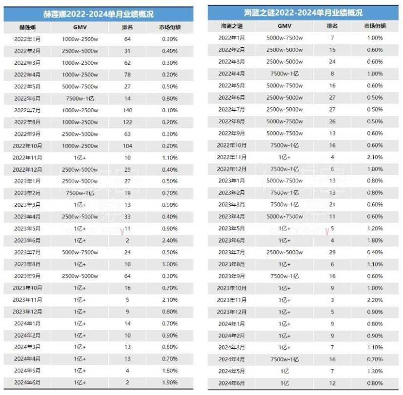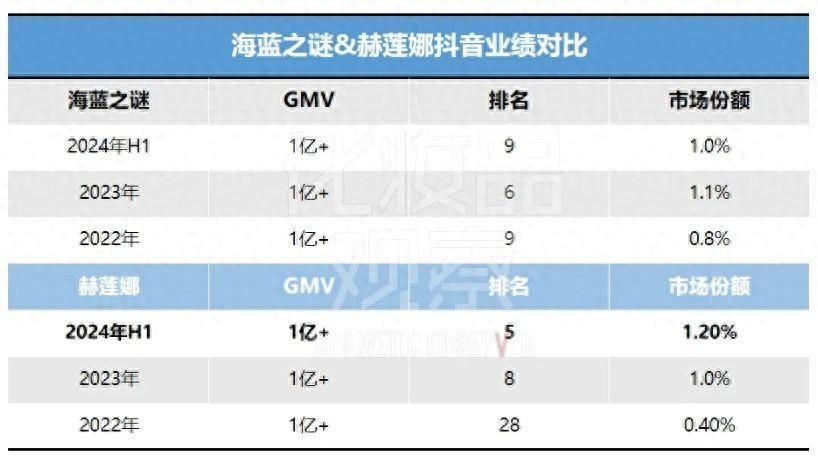 2024年上半年,是赫莲娜赶超海蓝之谜的关键时间节点:不仅排名领先4席,市场份额也超出0.2%。