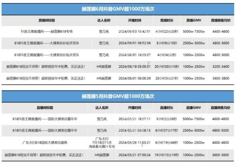 当然,这并不意味着赫莲娜的自播带货能力较弱。整个2024年H1,自营账号“HR赫莲娜”的带货占比达到50%以上。5-6月,赫莲娜超1000wGMV的自播场次达3场,超100wGMV的自播场次达55场。每天18-20小时的“日不落”直播,已然构成赫莲娜抖音GMV的蚂蚁雄兵。