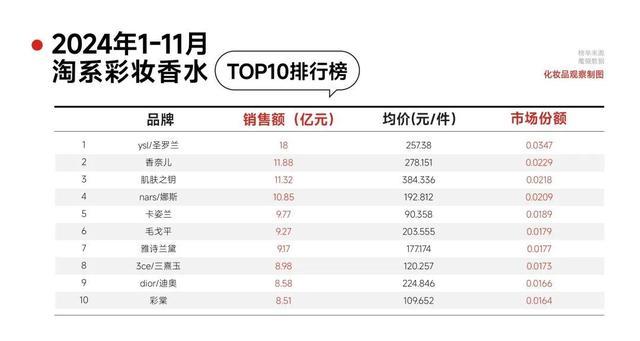 除了近10年彩妆品牌前十榜,《化妆品观察》还分别制得2024年1-11月淘系、抖音两大平台TOP10及20彩妆榜。从这三张图,可以看清彩妆品牌当前的市场竞争格局。