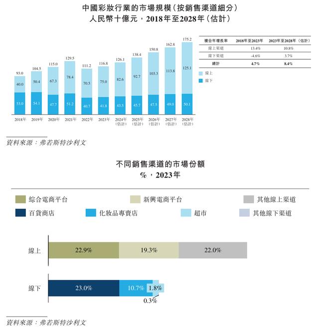 近年来,在天猫等电商平台以及抖音、小红书等新兴平台的带动下,彩妆市场逐渐由线上渠道主导。据弗若斯特沙利文,按零售额计算,彩妆的线上市场规模由2018年的400亿元增至2023年的750亿元,复合年增长率为13.4%。