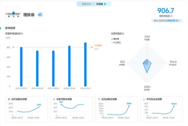 新榜品牌声量・美妆周榜(10 月 05 日 - 10 月 11 日)发布,理肤泉以 906.7 的声量新榜指数位居第五,环比上升 20 位 。作品数增加 729,账号数增加 42 ,互动量飙升 172.9w ,凭借一系列亮眼的品牌动作,在竞争激烈的美妆市场中强势崛起。