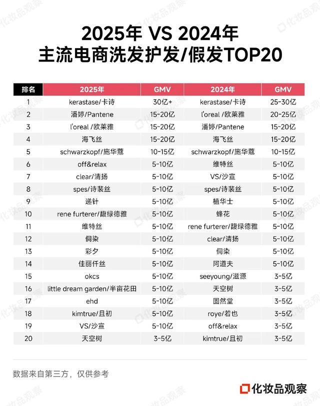 相比于护肤、彩妆类目TOP20品牌均突破10亿,洗发护发/假发突破10亿的品牌数量较少,仅5个,且全部是来自欧莱雅、宝洁、汉高旗下的国际品牌。其中,卡诗突破30亿,与第二名潘婷有10亿以上差距。