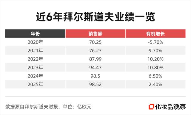 根据财报,拜尔斯道夫2025年销售额有机增长2.4%%至98.52亿欧元(约合人民币804亿元),跻身全球美妆排行榜前五。