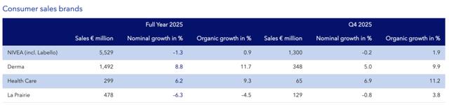 2025年,拜尔斯道夫消费品业务中,莱珀妮是唯一下滑的业务单元,且下滑颓势已经延续3年。2023年至2025年,莱珀妮的销售额分别有机下降了15.4%、6.2%、4.5%。