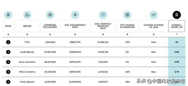 作为全球美妆行业的权威销售数据标尺,英国美容产品比价网站Cosmetify凭借多维度大数据分析,成为衡量美妆品牌全球影响力的重要参考。该平台综合粉丝量、月搜索量、品牌影响力评分等多维度综合评估,评选结果真实反映全球美妆品牌的真实市场热度与消费者偏好。