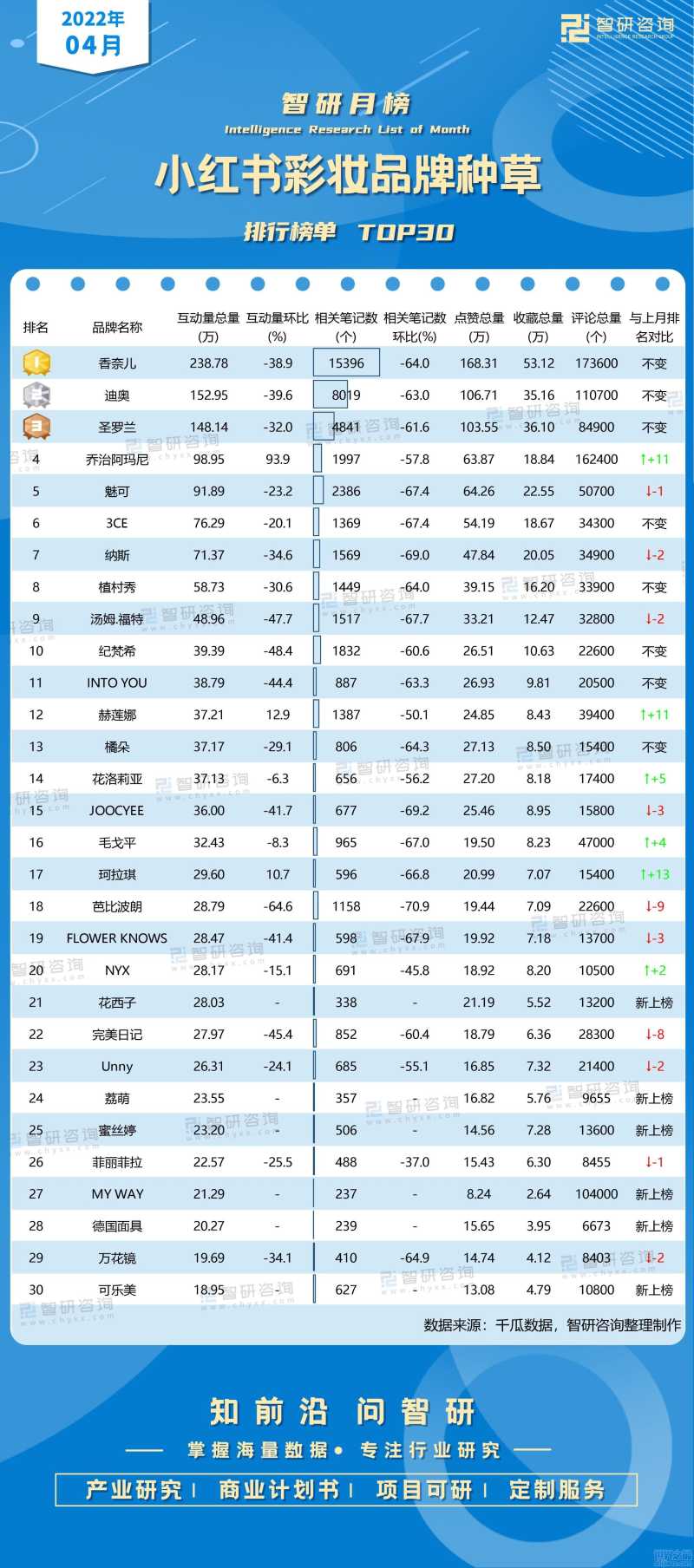 2022年4月小红书彩妆品牌种草排行榜(附月榜TOP30详单)