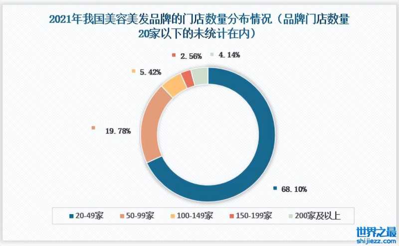 品牌门店数量来看,大部分品牌门店数量不足50家;门店数量50-99家的美容美发品牌则占比为20% ;而全国门店数量超过200家的美容美发品牌占比只有4.1%。
