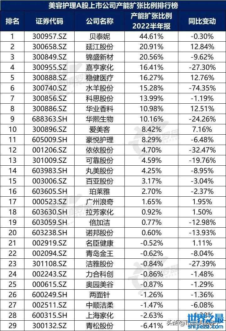2022上半年美容护理行业A股上市公司中有1家产能扩展比例大于30%。榜单前三发生改变,贝泰妮(44.61%)代替水羊股份排名第一,延江股份(20.91%)排名第二,锦盛新材(20.56%)代替嘉亨家化排名第三。