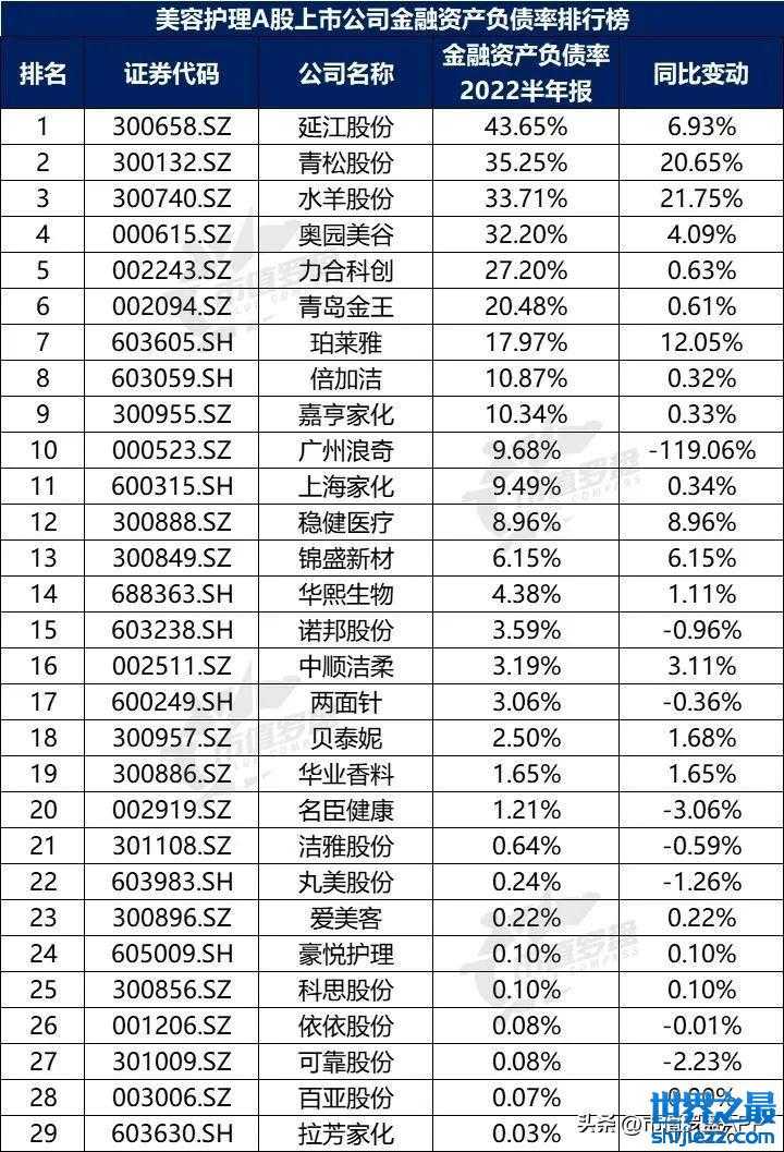 图19:美容护理行业A股上市公司金融资产负债率排行榜