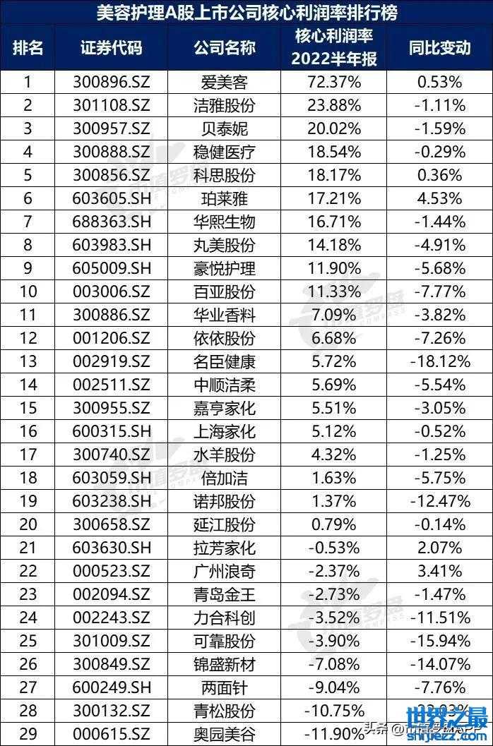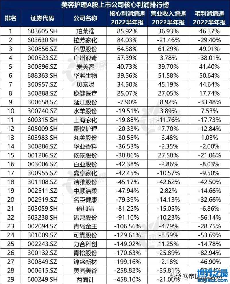 2022上半年美容护理行业A股上市公司6家核心利润增长,14家核心利润出现下滑。