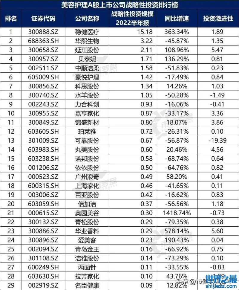 图17:美容护理行业A股上市公司战略性投资排行榜