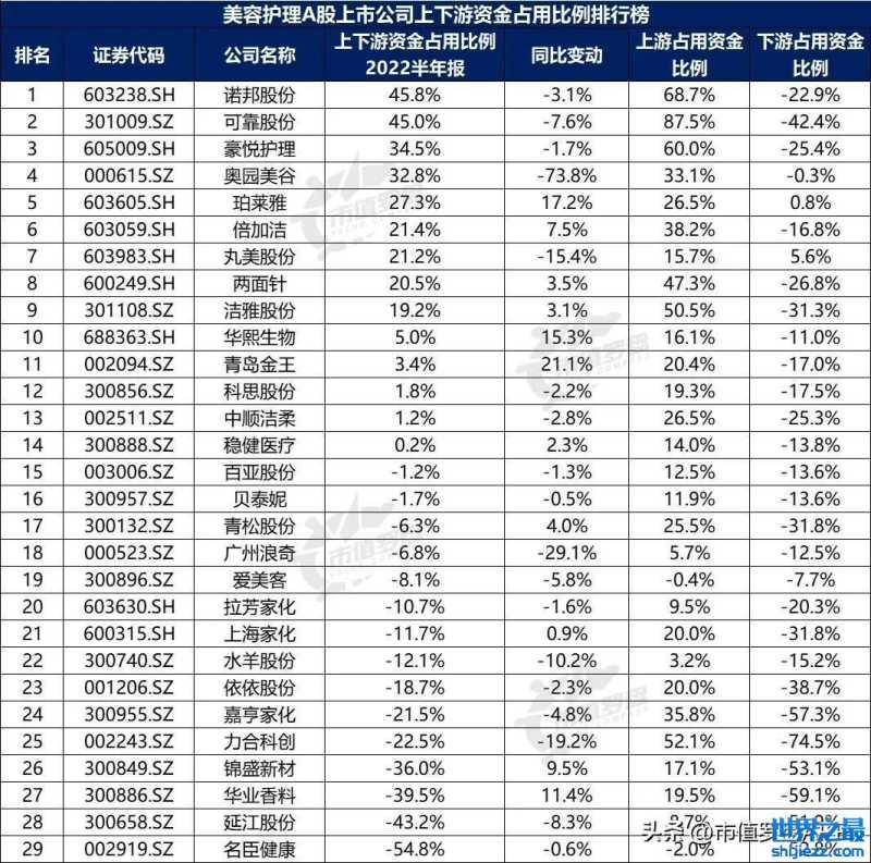 图15:美容护理行业A股上市公司上下游资金占用比例排行榜