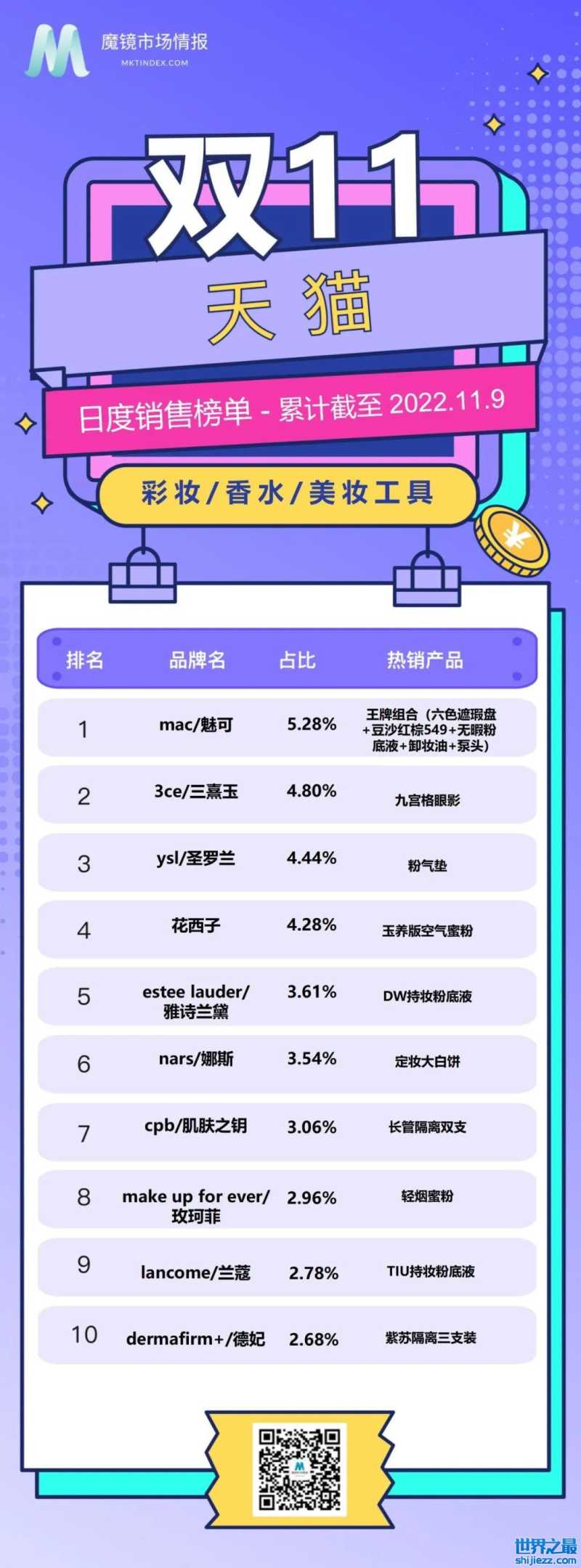 今天,魔镜市场情报为大家盘点一下美妆、个护行业中,天猫平台截至11月9日含预售的累计销售额品牌排行。