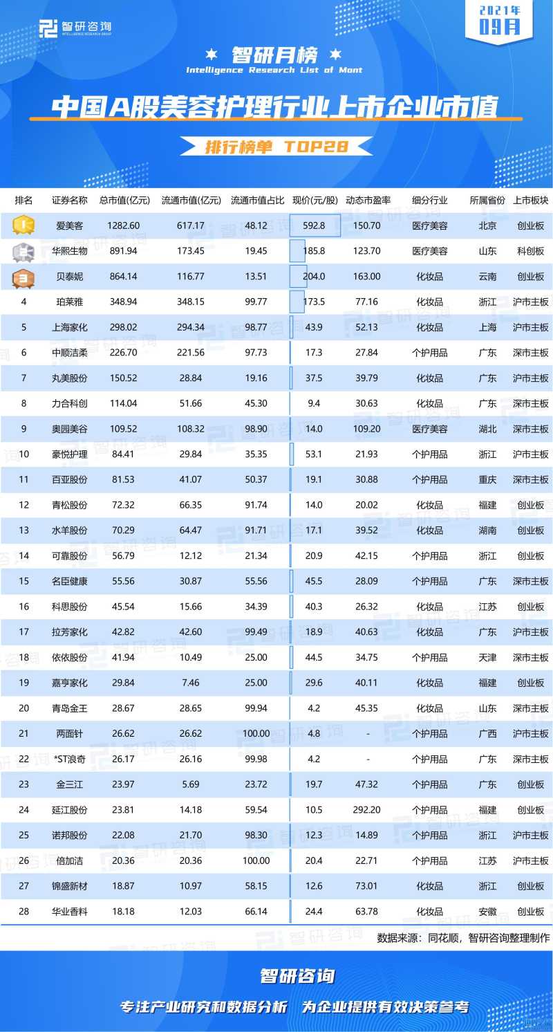 2021年9月中国A股美容护理行业排行榜(附月榜TOP28详单)